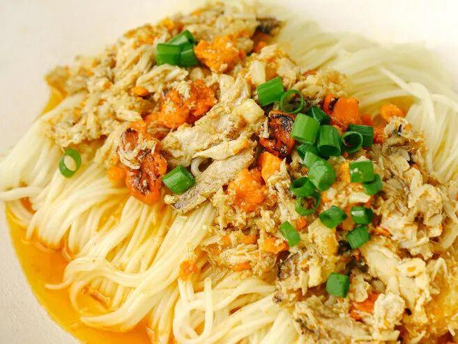 煮碗素面,舀两勺进去。就这么简单的一拌,每根面条都裹上了金黄油亮的蟹粉。