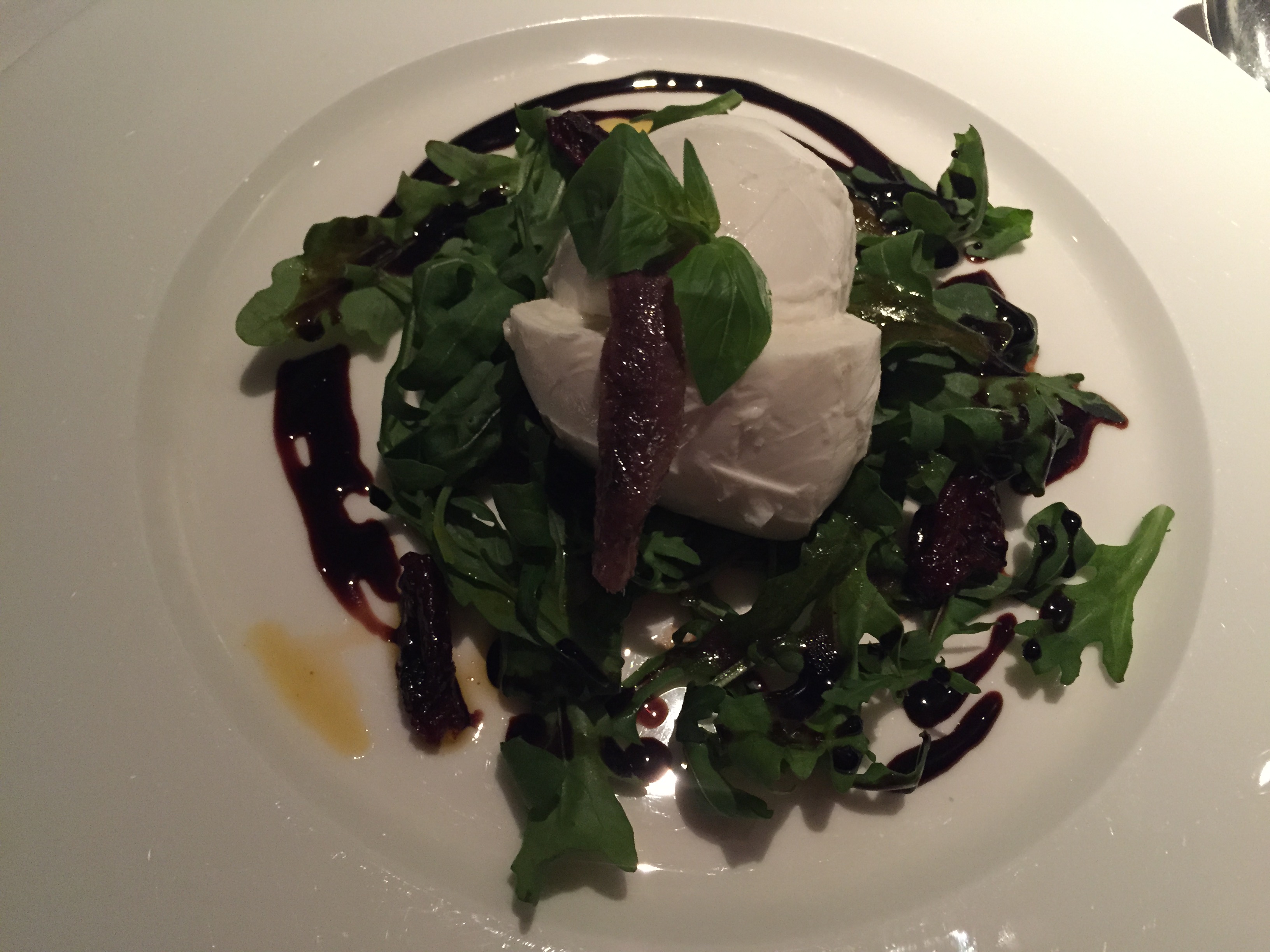 水牛芝士配蒲公英嫩叶(俗称水菜,Dandelion Green ,吃起来有点苦味),再点缀上一根 anchovy 里脊的意式沙拉 (图 © 吃很重要)