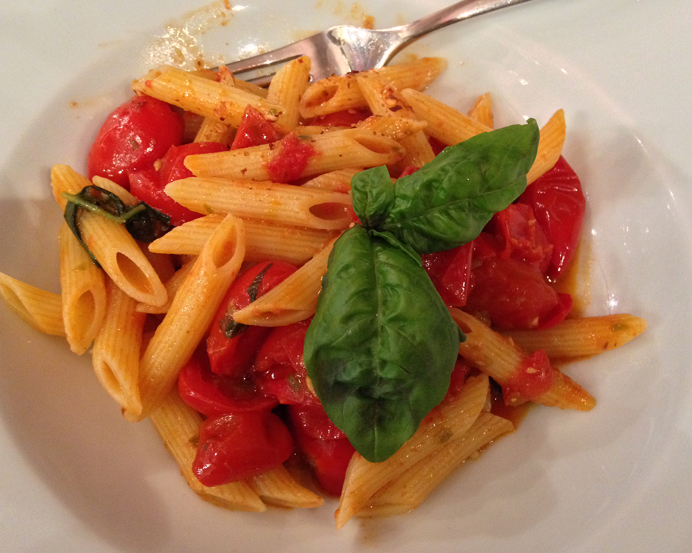 拿一只平底锅,以蒜片和橄榄油起锅,把稍微切成细条的凤尾鱼放入(因为比较咸,建议放之前先尝尝,再根据个人喜好放)煎一小会,然后你厨房就立即充满鱼的香味(开放式厨房就略伤…);翻炒一两分钟,就会发现明明一条条的鱼肉都陆续不见了,化身成为美味的汁液,再把橄榄(一颗切成大概三瓣)、酸豆和番茄(切得大概拇指大小的一块块)悉数放入一起炒,最后放罗勒和干辣椒;然后…就没有然后了。