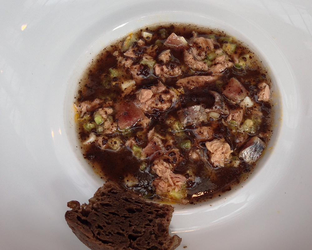一道看着略难看、但味道极鲜的前菜,主材料是番茄汁、水瓜、橄榄当然还有 anchovy !(图 © 吃很重要)