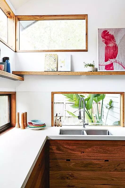 2 两窗之间的小空间,加一条窄搁板。搁板材质和窗框保持一致,不仅填补了这块空白,还能让小窗有一种延伸感。