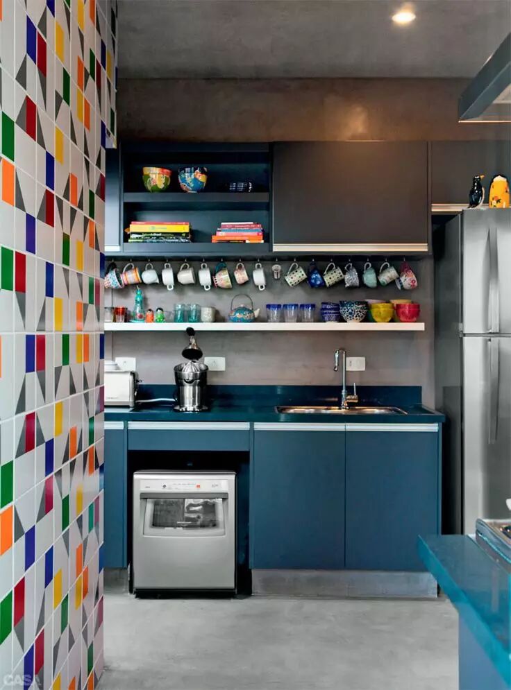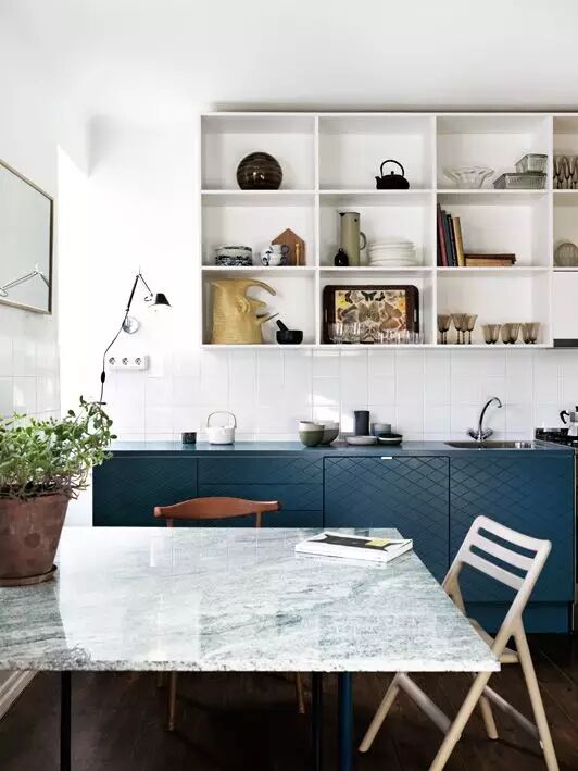 3 在橱柜下方安一条搁板,摆放收藏的漂亮餐具。白色搁板,刚好和橱柜把手的白色条纹元素相配。