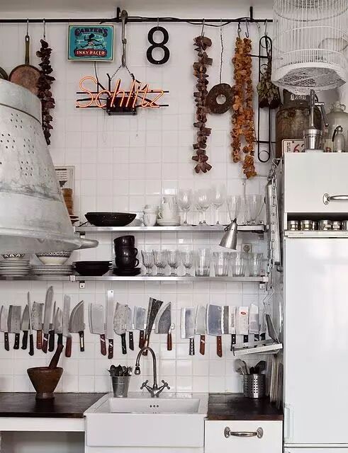 9 不锈钢搁板+白瓷砖墙,干净清爽。不过,这么多菜刀……屋主是厨师吗?