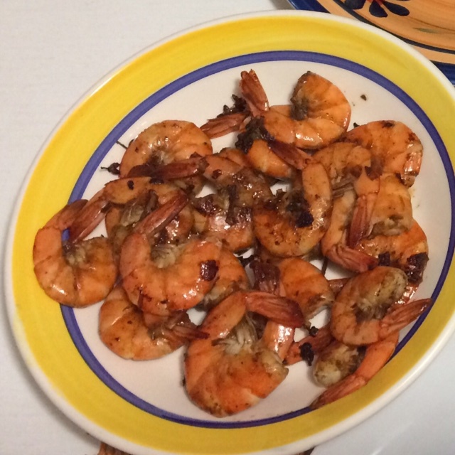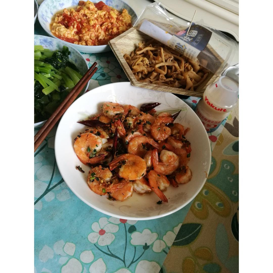 好大的明虾,没有去头、开背,虾黄别浪费了。好多姜、蒜慢慢煎制,满屋飘香哦。都忍不住要给自己点赞啰,嘿嘿。。。。