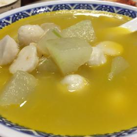 #午餐•2014年4月27日# 忙了一个礼拜,袁先森周末乖乖在家洗手做羹汤,自己剁肉挤出来的鱼丸做的冬瓜鱼丸汤。