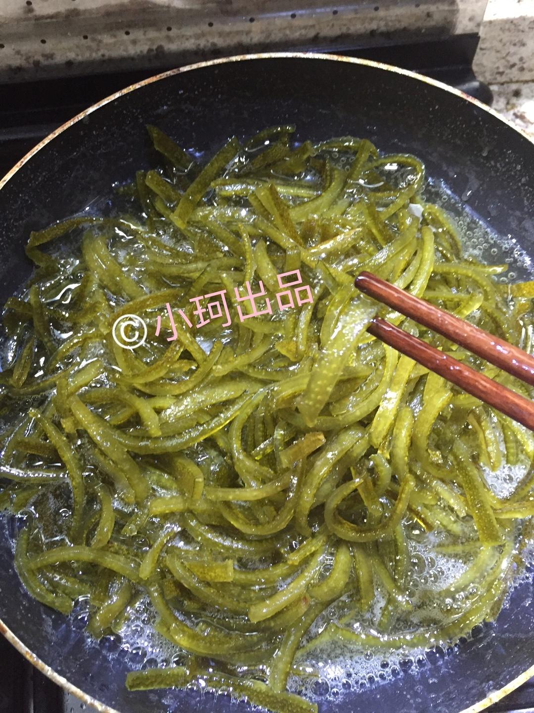 经过几次挤水换水以后,柚子皮的苦味去大半啦,个人觉得带点苦味更好吃.把冰糖煮开(最好用不粘锅),挤干水的柚子皮条放入翻炒,大火.