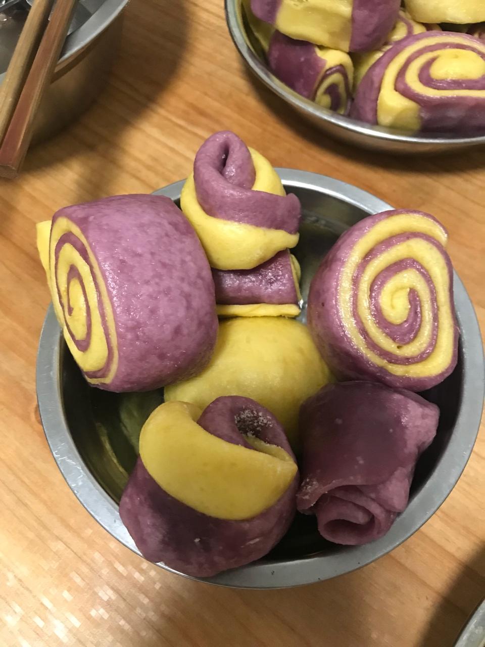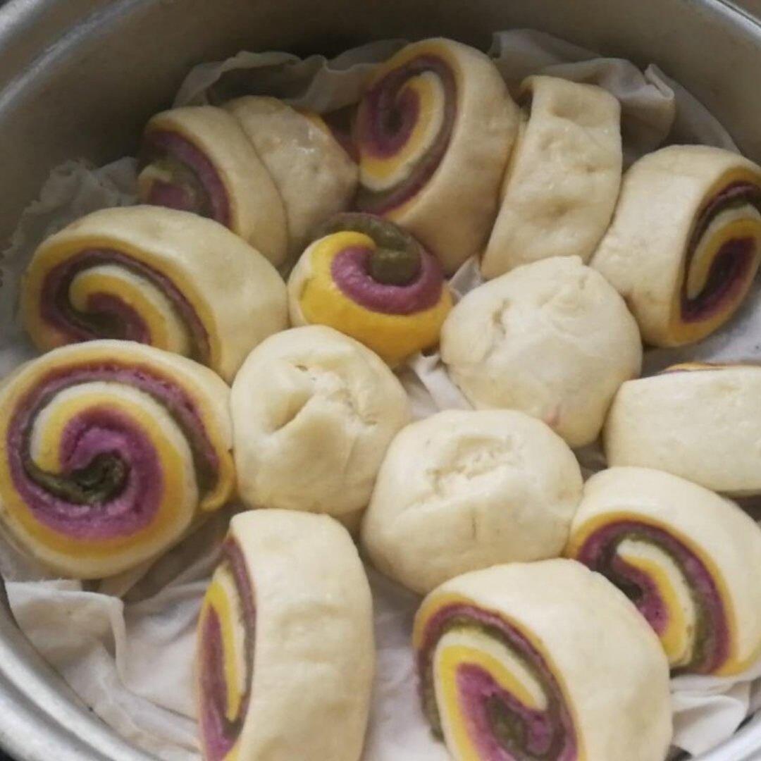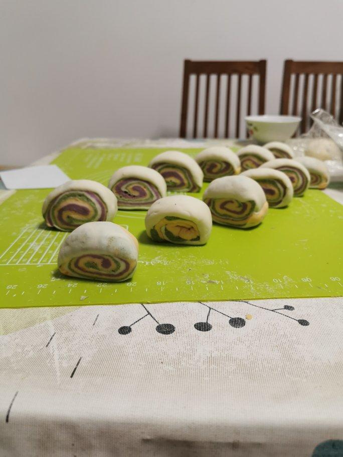 超级好看,紫色的是紫薯,黄色的是蜜薯,绿色的是用做青团时余下的艾草做的,我女儿说彩虹馒头很好吃!