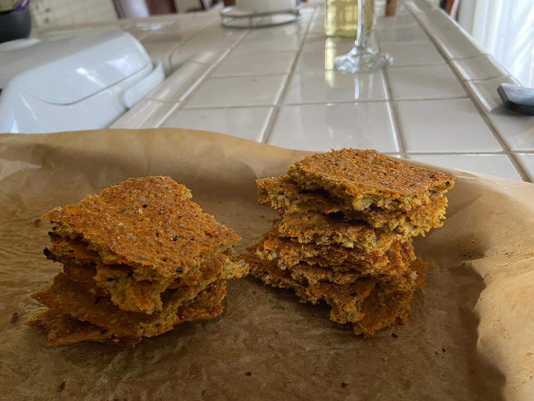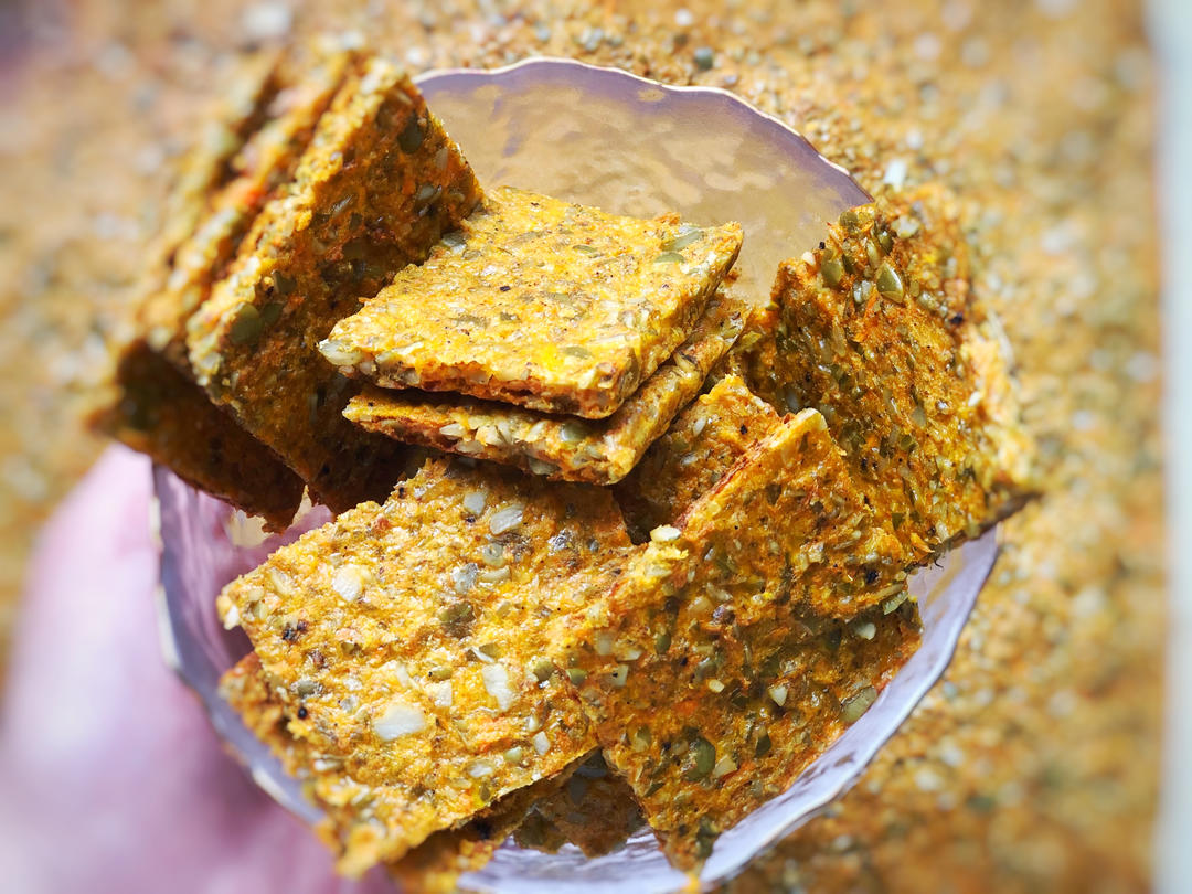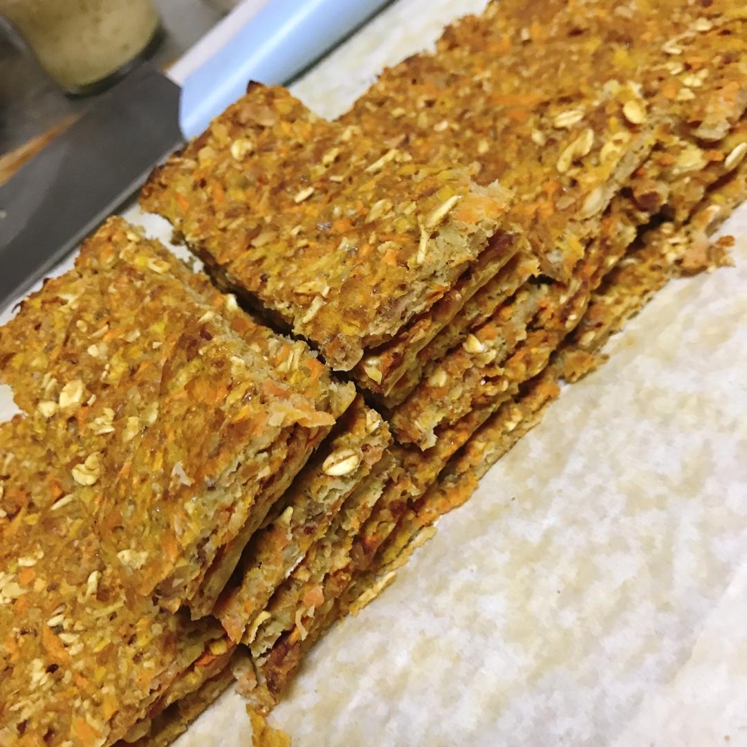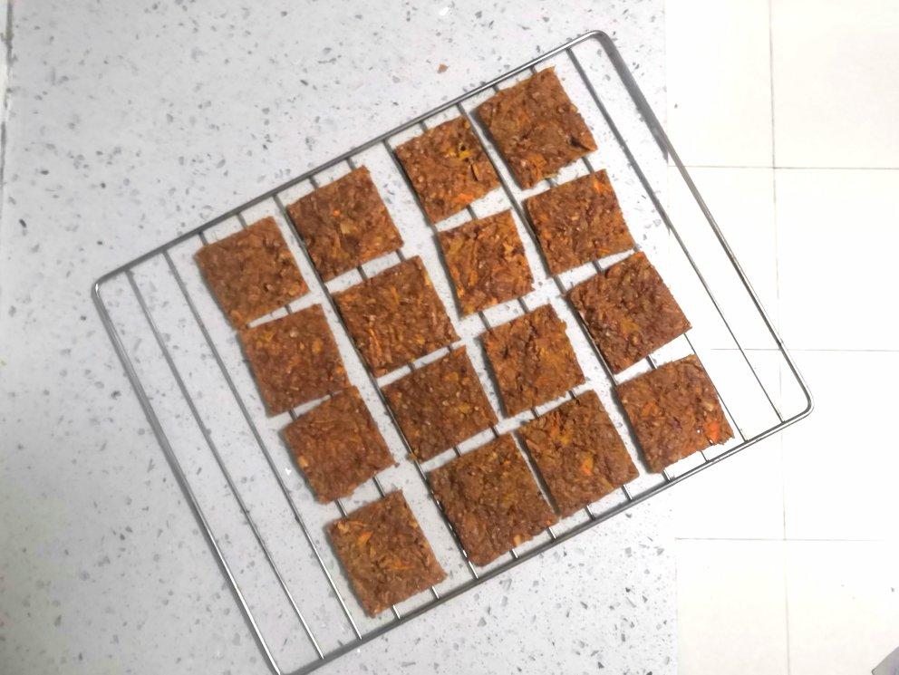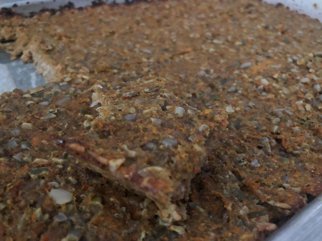 不知道是胡萝卜水份太多还是鸡蛋放多了原因第一盘出来外面快焦了,里面还是软的。(因为是小鸡蛋就放了5个)第二盘就加了南瓜籽,椰蓉,白芝麻与燕麦片。最后165度烤一小时才偏硬一些。老爸说好吃😂
