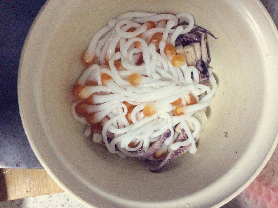 海蘑菇洗干净,泡水冷水 鱿鱼化冰撕去表面黑膜,去内脏,洗净,过热水,捞出,切丝或薄片,可根据个人喜好