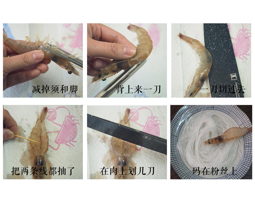 泡软的粉丝沥干水分→垫底,放上虾,虾背中间加入蒜蓉汁。