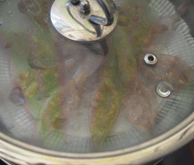 蒸锅大火上汽后,放入摆好的虾,大火蒸5分钟。