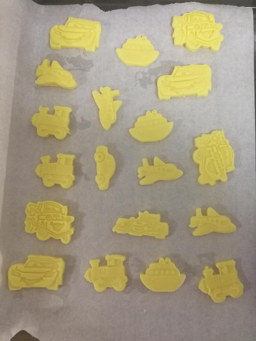 用擀面棍将面团擀平,然后用自己喜欢的饼干模子印模,再将印模的面团放在铺有油纸的烤盘中。 PS:铺油纸为了防止饼干黏连。