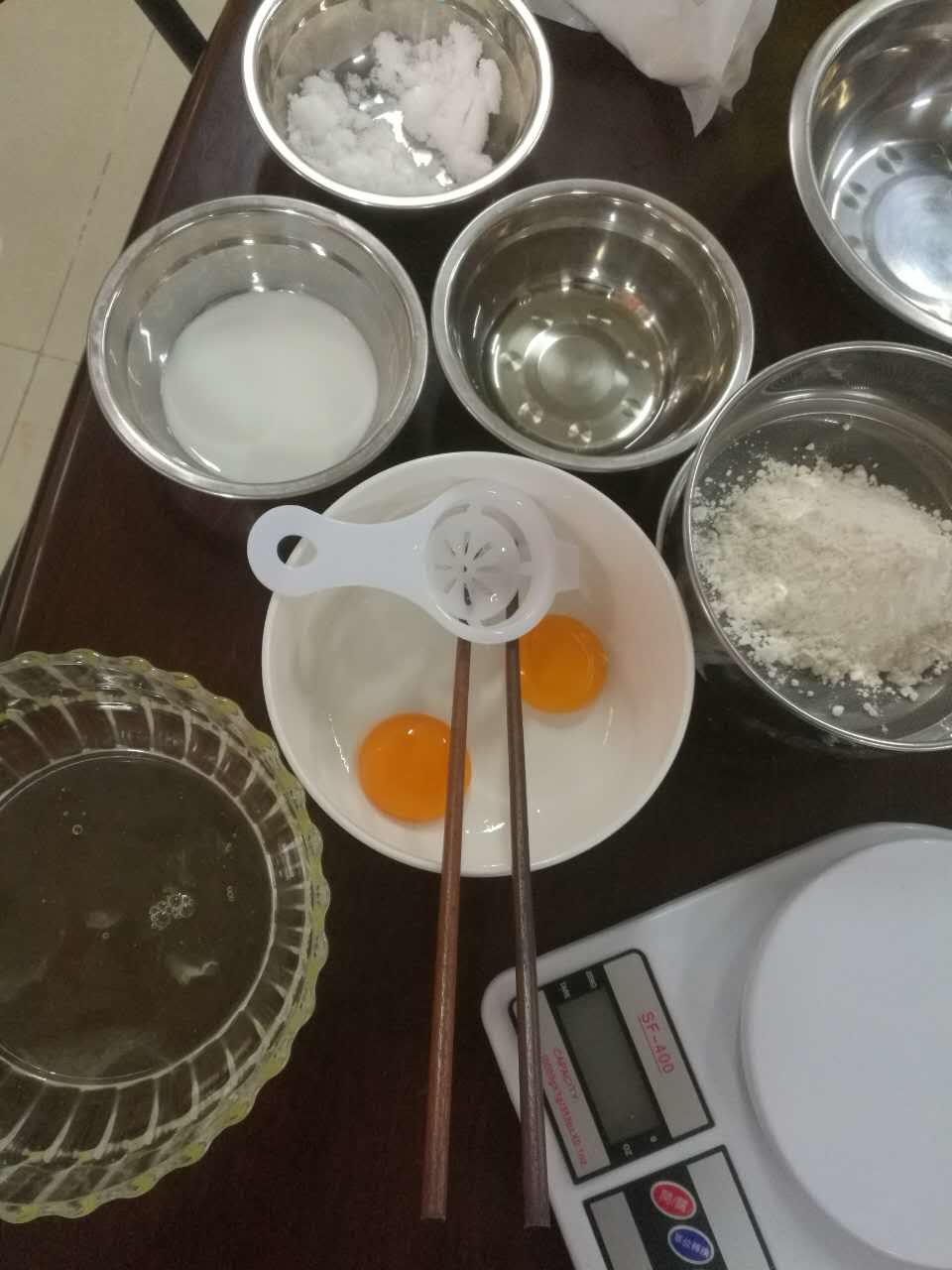 蛋清与蛋黄分离, 把所需材料都备齐待用。 糖: 蛋清用25g绵白糖分4次加入蛋清中,打匀后再加入下一次糖。 蛋黄用糖15g 淡奶油用糖18g 牛奶30g 低粉40g 食用油10g 白醋2滴放入蛋清中