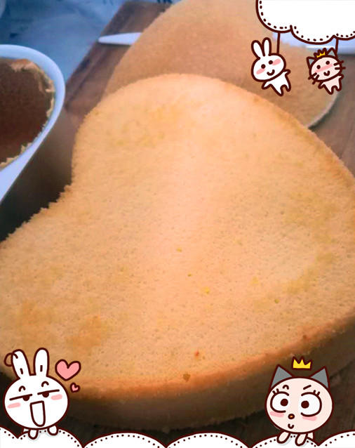 爱心蛋糕的奶油产品没有拍图留着,用另外一次的圆形蛋糕图来补充。中间夹上奶油和水果,再盖上上层蛋糕,开始抹面,技术不好,看着坑坑洼洼的。