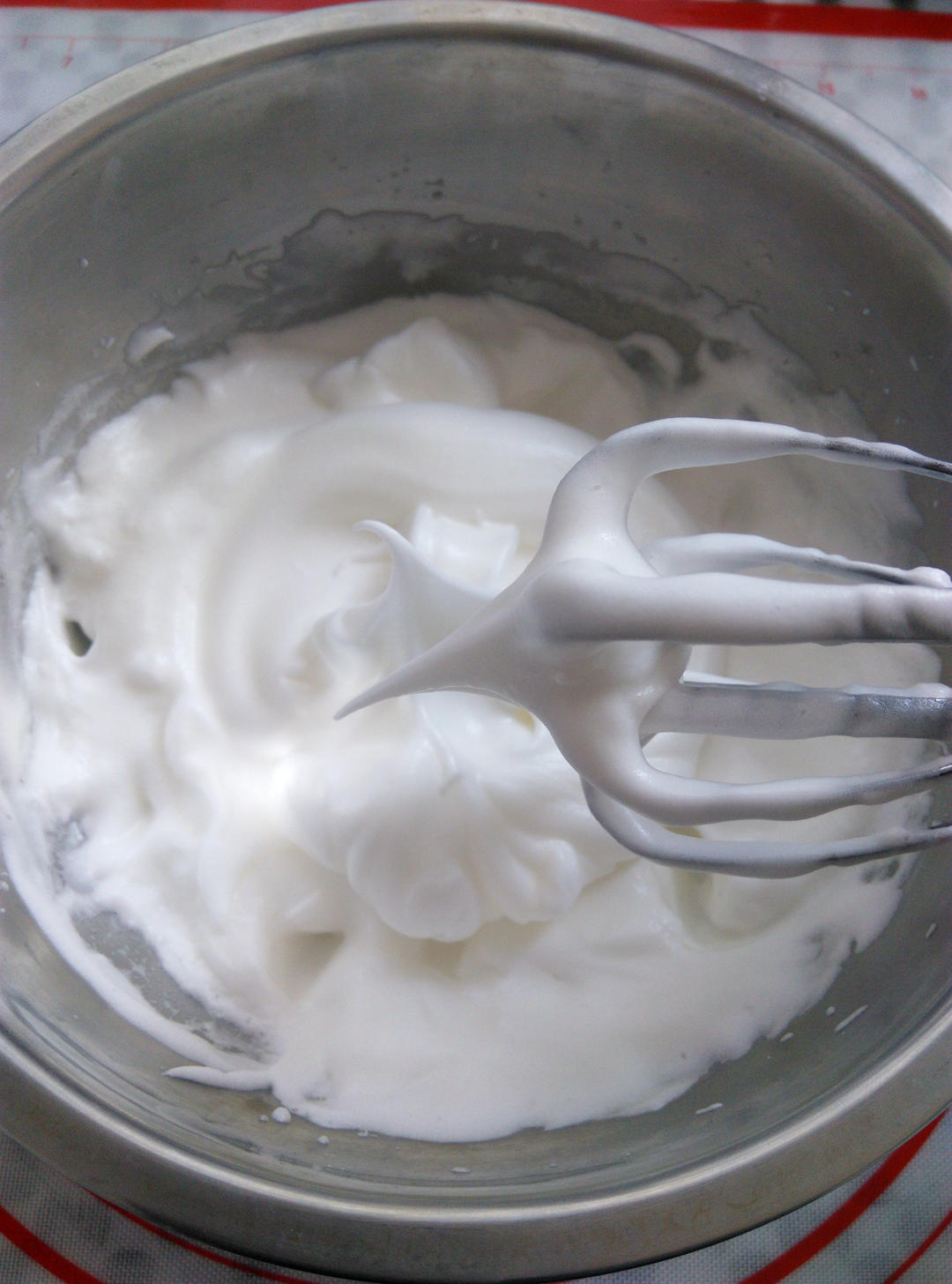 打发蛋白,25克糖分3次加入,打发到偏干性,提起打蛋头蛋白霜是小而尖的状态,蛋白打发好后马上预热烤箱150度
