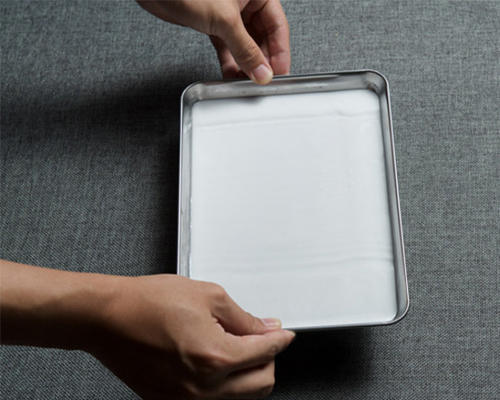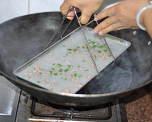 在锅内倒入适量的水,煮开,将盛有粉浆的铁盘放入锅内隔水蒸; 一次制作多碟肠粉可以将铁盘十字型层叠错开: