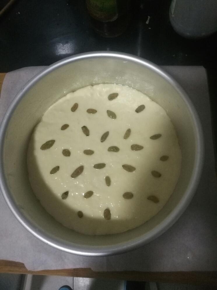 将蛋糕模底和四周都刷上玉米油后,将面糊倒入里面,上面粘上油抹平,排好葡萄干,用保鲜膜封好放到温暖的的地方发酵至三倍大