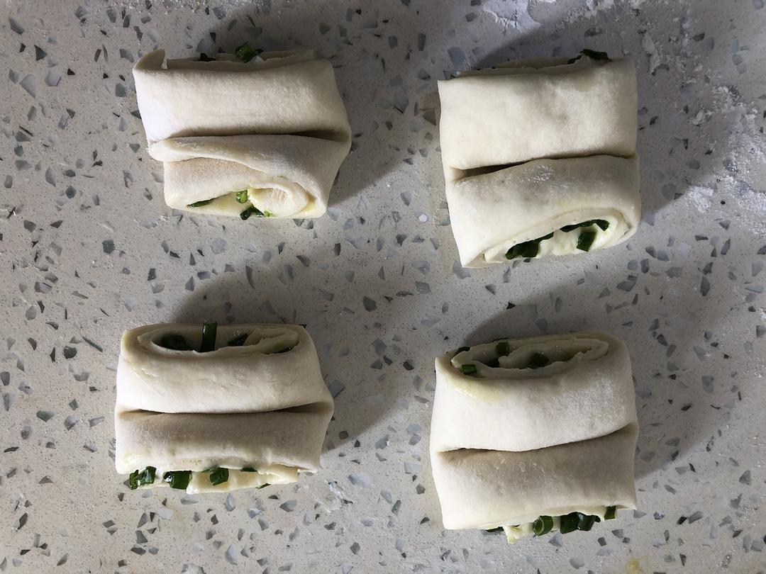 将揉好的面擀成薄片,在面上刷上油和盐,撒上葱花。