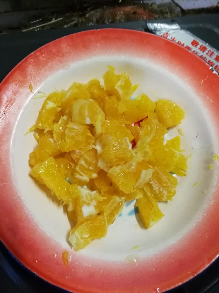 稍微多放点油,凉油下橙子。橙子里面有水汽,如果热油下橙子的话,会爆的。