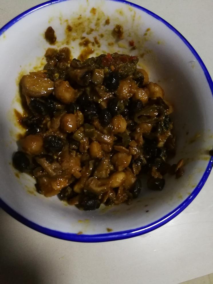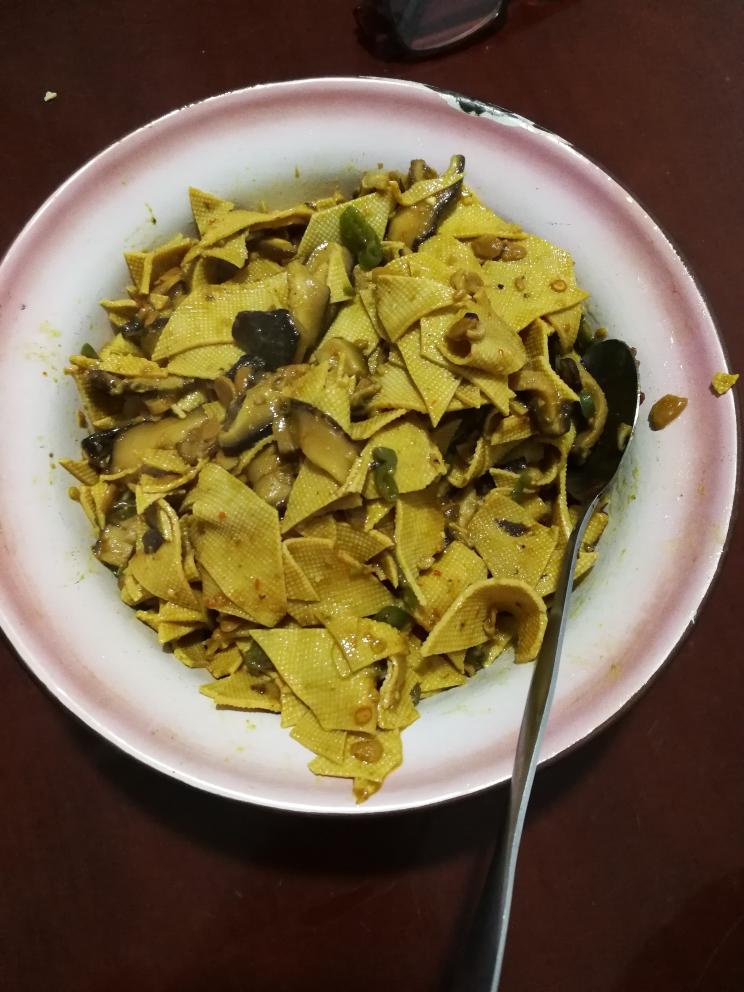 还是香菇,橙子,辣椒,黄豆酱这几样,加上千张切菱形,汁水收净,和超市里香菇豆干味道差不多。主要是人出不去,权当零嘴吃了