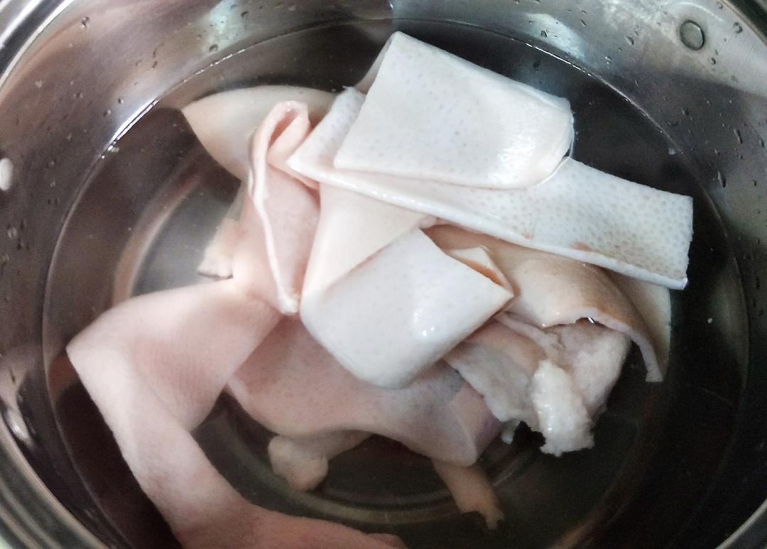 新鲜的猪皮焯水,拔去猪毛,将猪皮的油脂刮干净(这样熬出来的猪皮冻没那么油腻)