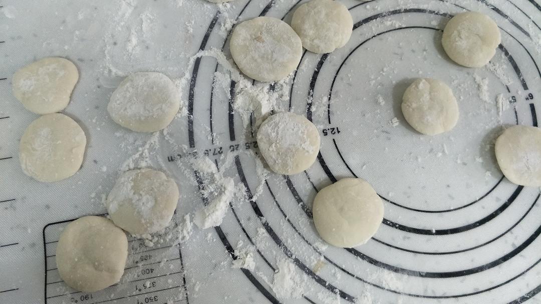 面团分成约10克左右的小剂子,搓圆后压扁。