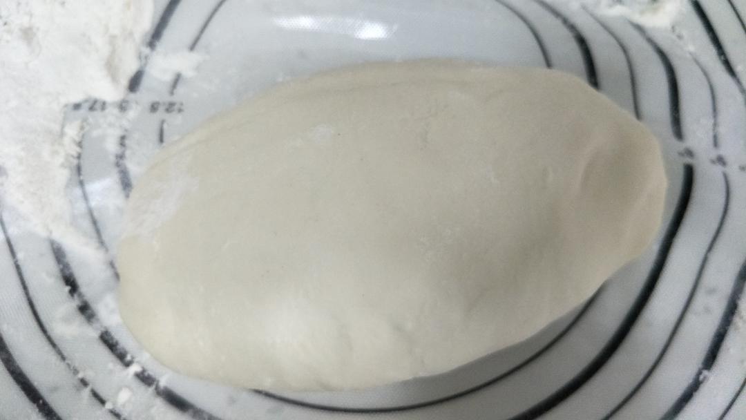 和面。中筋面粉中加入少许盐搅拌,加入水,(如果用面炮机的和面功能,可以将这几样材料一并放入桶中),当形成光滑面团后,面团盖上一层保鲜膜,饧发约半小时。