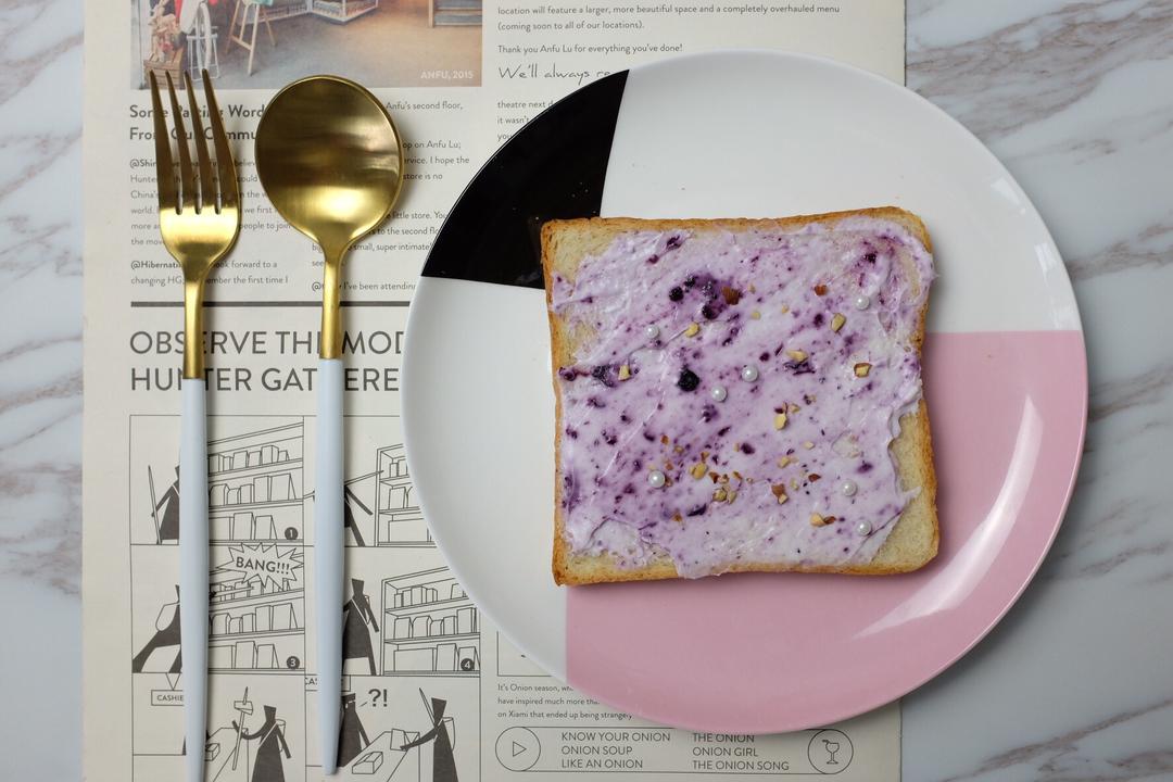1.买不到希腊酸奶的可以自己过滤,前一天晚上过滤,早晨起来就可以用了 2.过滤好的酸奶分成三份,分别加入牛油果泥,蓝莓酱,色素粉,用勺子搅拌 注意不要搅拌的太过,稍微混合一下就好,留着纹路 3.吐司150°C烤5分钟,稍微上色即可,用勺子抹上混合好的酸奶,表面装饰白色糖珠、黄桃、坚果碎、椰子片碎 是不是超级简单!