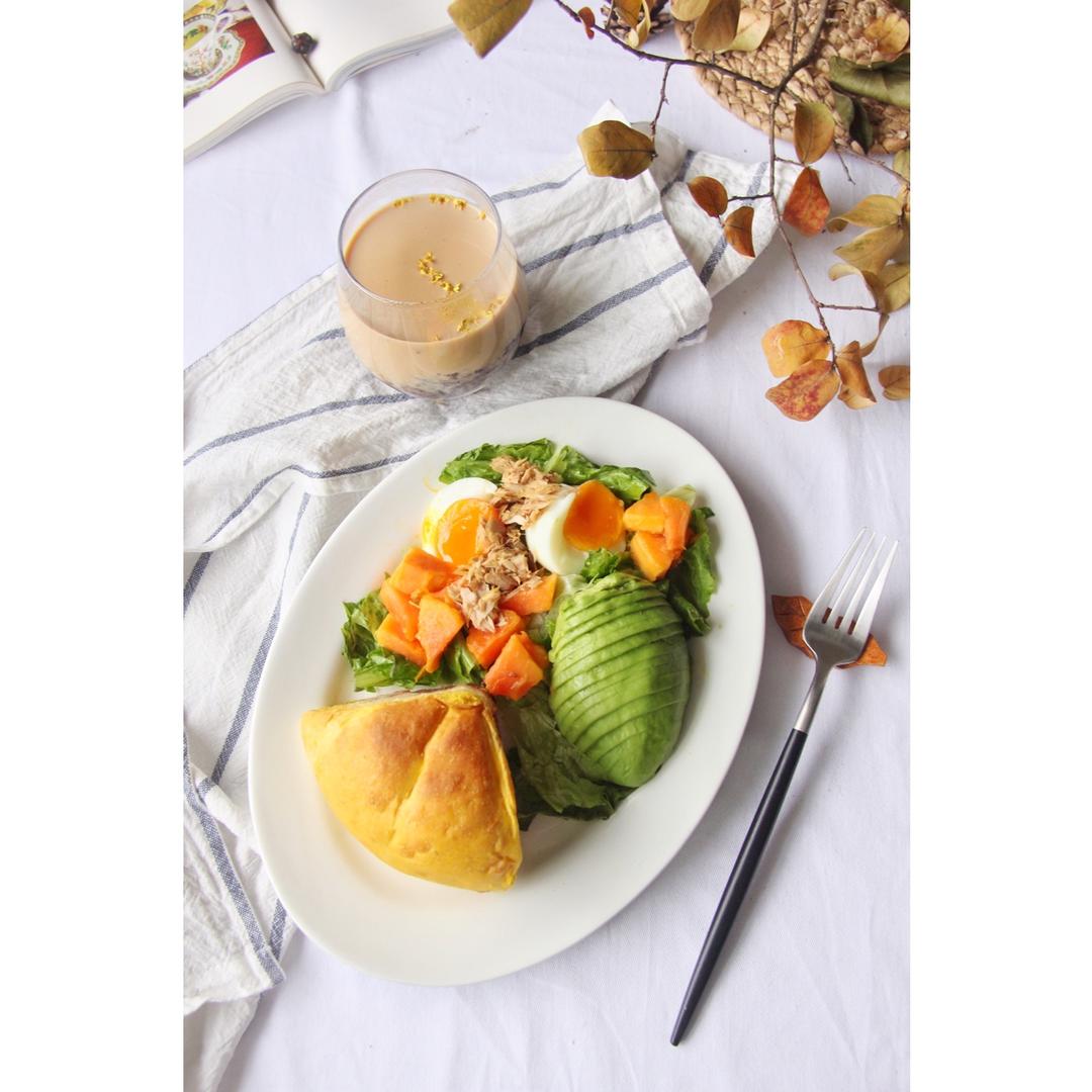 今日朝食:麻薯豆沙南瓜包、蔬菜沙拉➕紫米燕麦桂花奶茶