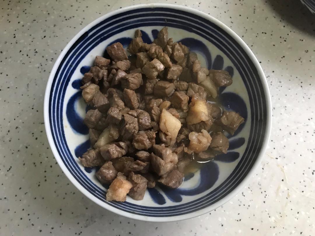 牛排冲洗一下之后切成小块,加少许料酒,生抽,一小勺细砂糖,几滴食用油