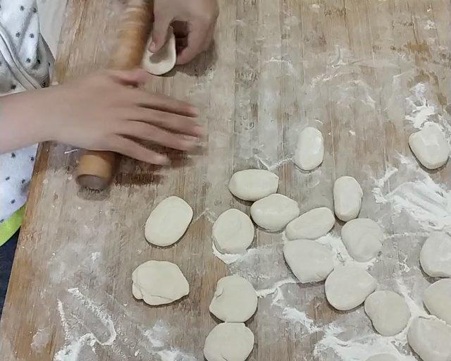 将面团揉捏拉长后切成一个个面剂子压扁。
