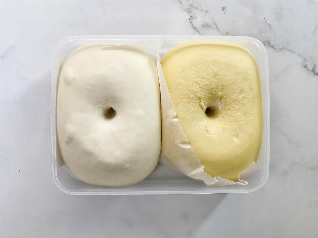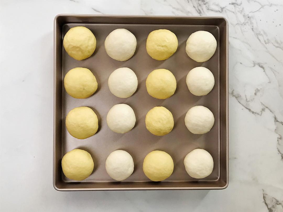 将白、黄面团各分成8份,揉圆盖上保鲜膜静置10分钟