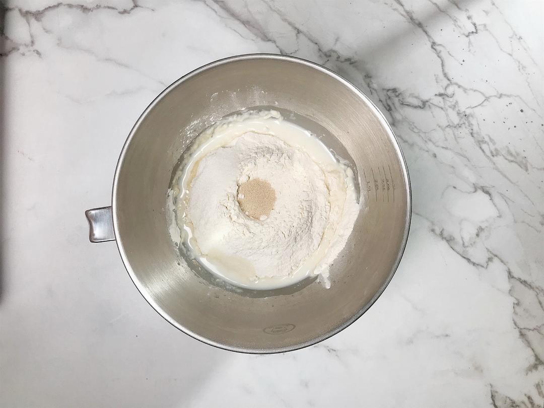 准备好材料,将面团(除黄油外)全部一起倒入厨师机混合