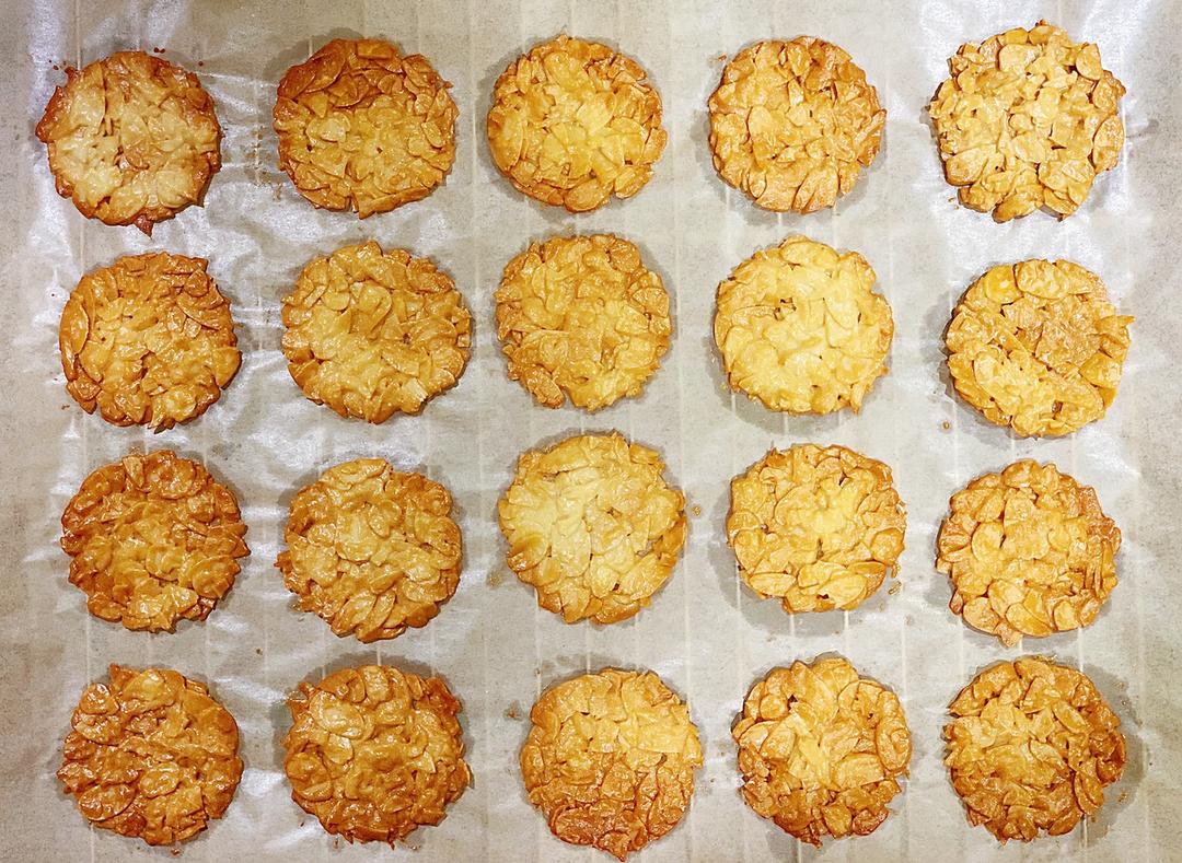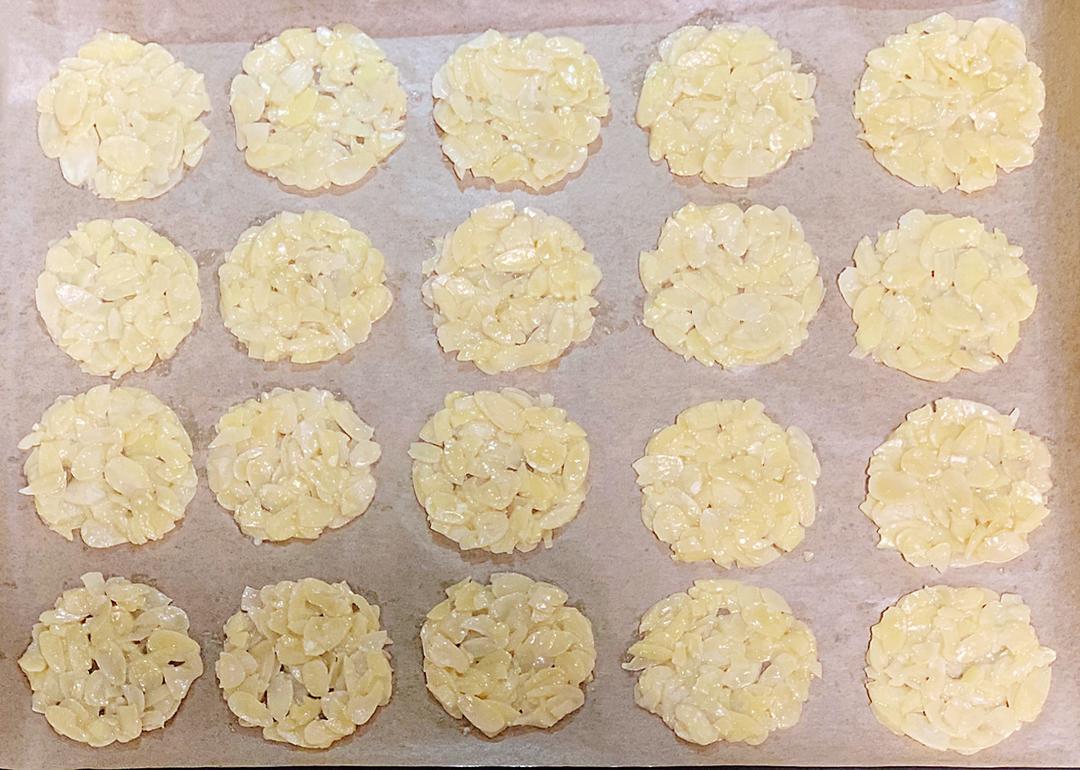 把杏仁瓦片送入烤箱烤制10-12分钟 待边缘略微发黄后取出晾凉