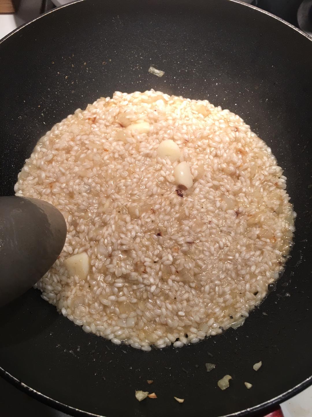 热锅 橄榄油,洋葱和蒜放进去煸软。此刻可以加入白葡萄酒 味道会更好 我没加因为没买。然后放入米 我说了最好是arborio 米 实实在在买不到的话用糯米也不是不能吃。