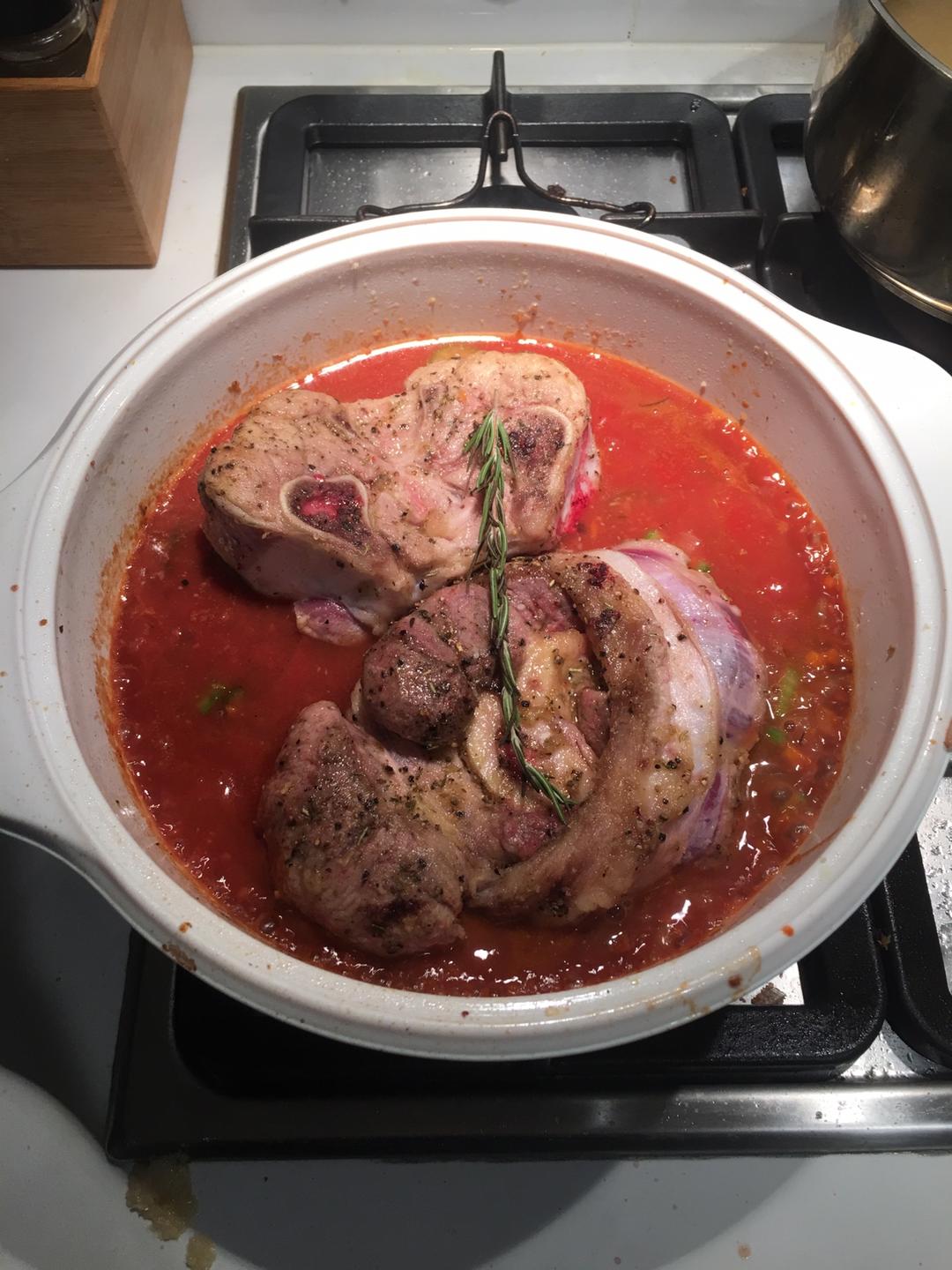 倒入番茄酱之后 加入400克的鸡汤 放入煎好的牛肉,迷迭香和香叶开始炖 期间要注意翻底 以及常用酱汁淋一下朝上的那面。