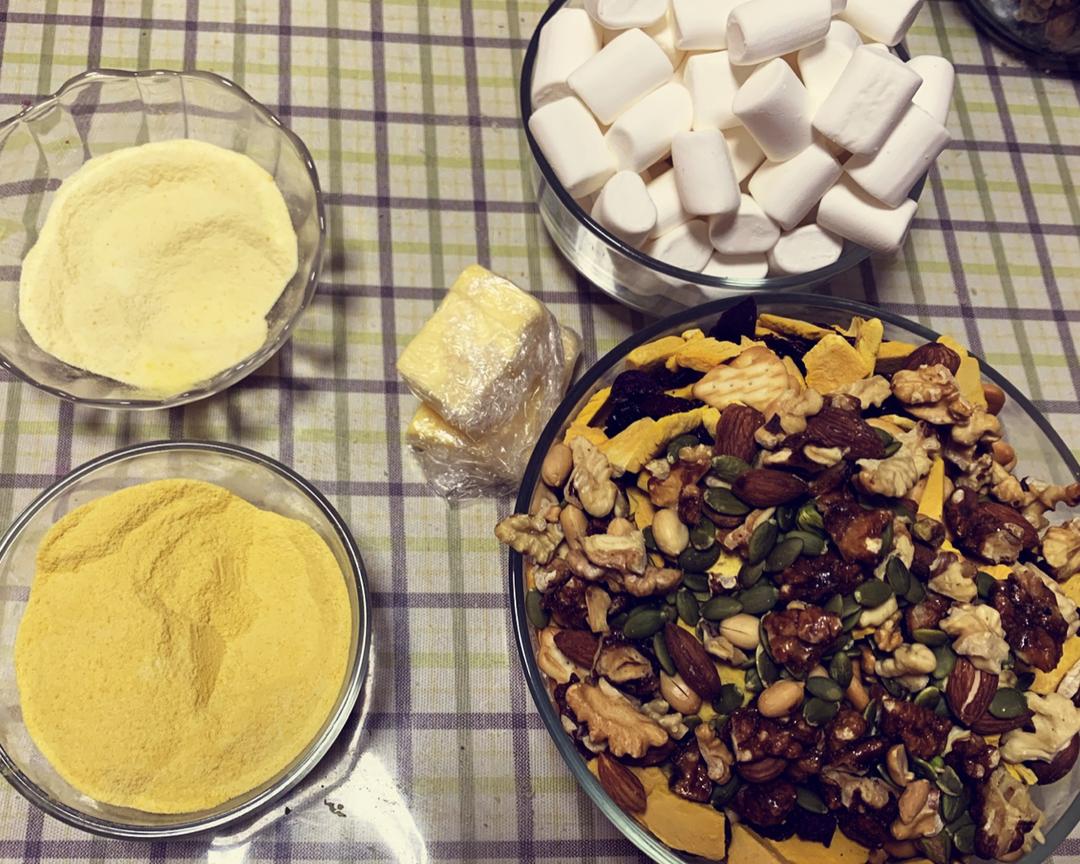 准备材料:饼干、果干、坚果放到一起过混合均匀,南瓜粉与奶粉混合均匀,撒面的奶粉和南瓜粉混合均匀,准备不粘锅(一定要用不粘锅哦!)硅胶刮刀、不粘烤盘,刮板等等,把所有一切需要用的都准备好。