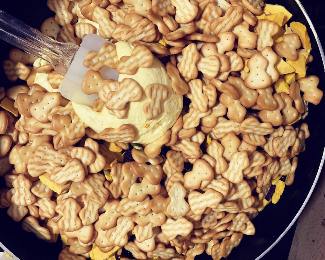 加入饼干坚果和果干,用刮刀将棉花糖和饼干混合成团。