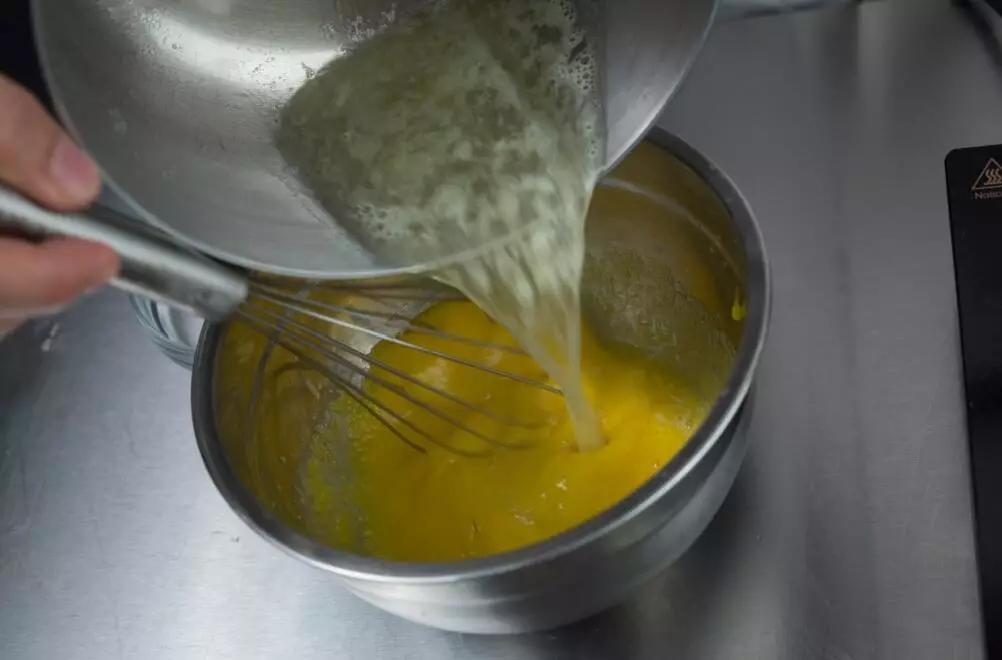 3. 将沸腾的汁液倒入蛋黄并搅拌均匀,将蛋奶糊倒回锅中小火加热,并不断搅拌以免糊底,至蛋奶糊颜色发白,状态起稠离火。