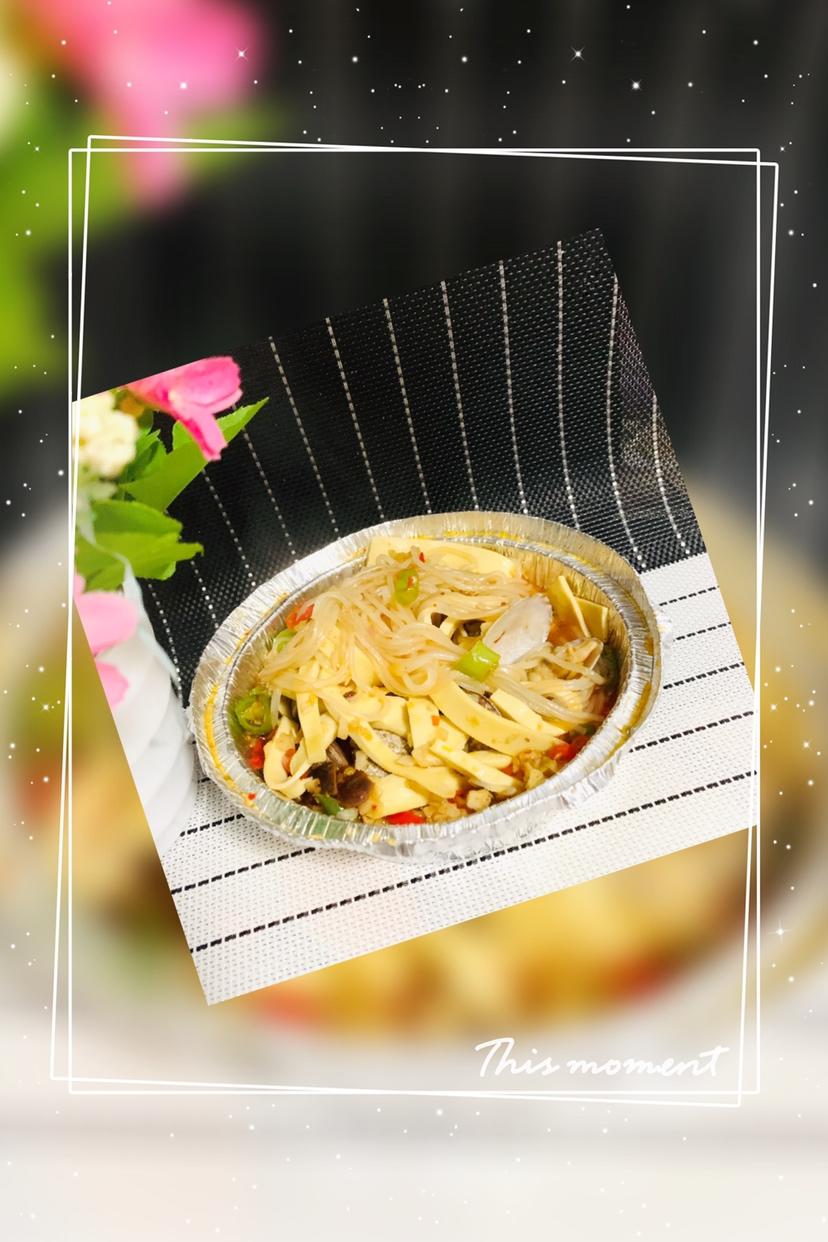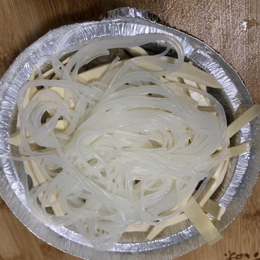 锡纸碗放入花甲,金针菇,粉丝,千张皮