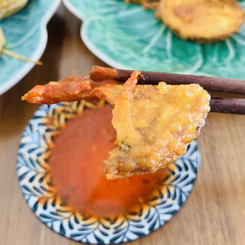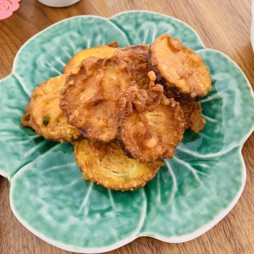 面粉➕鸡蛋➕温水搅匀,茄子🍆削皮切片放在搅匀的面糊糊里裹好,轻轻放油锅里,不要着急用筷子翻面等金黄定型再翻面两三次就OK,我这个切的薄不用二次回锅炸。