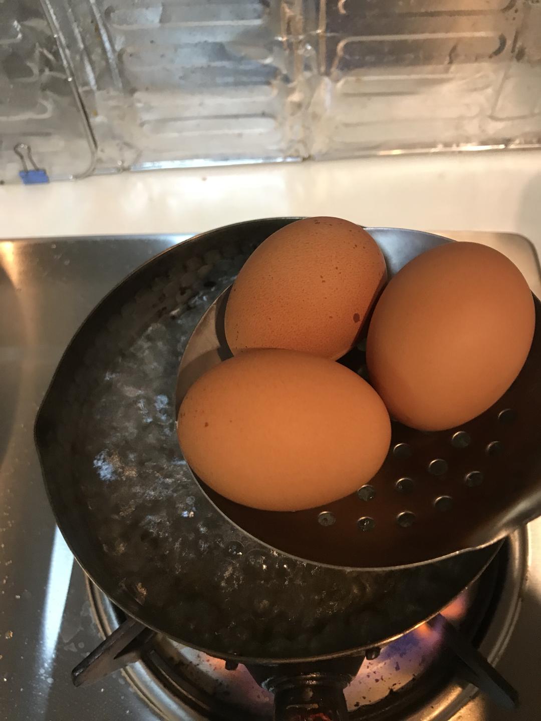 水开下去鸡蛋,盖盖子煮5分30秒,这个是蛋黄比较软可以流动的状态,喜欢硬一点的煮6分钟,6分钟是有点发黄的标准溏心蛋。