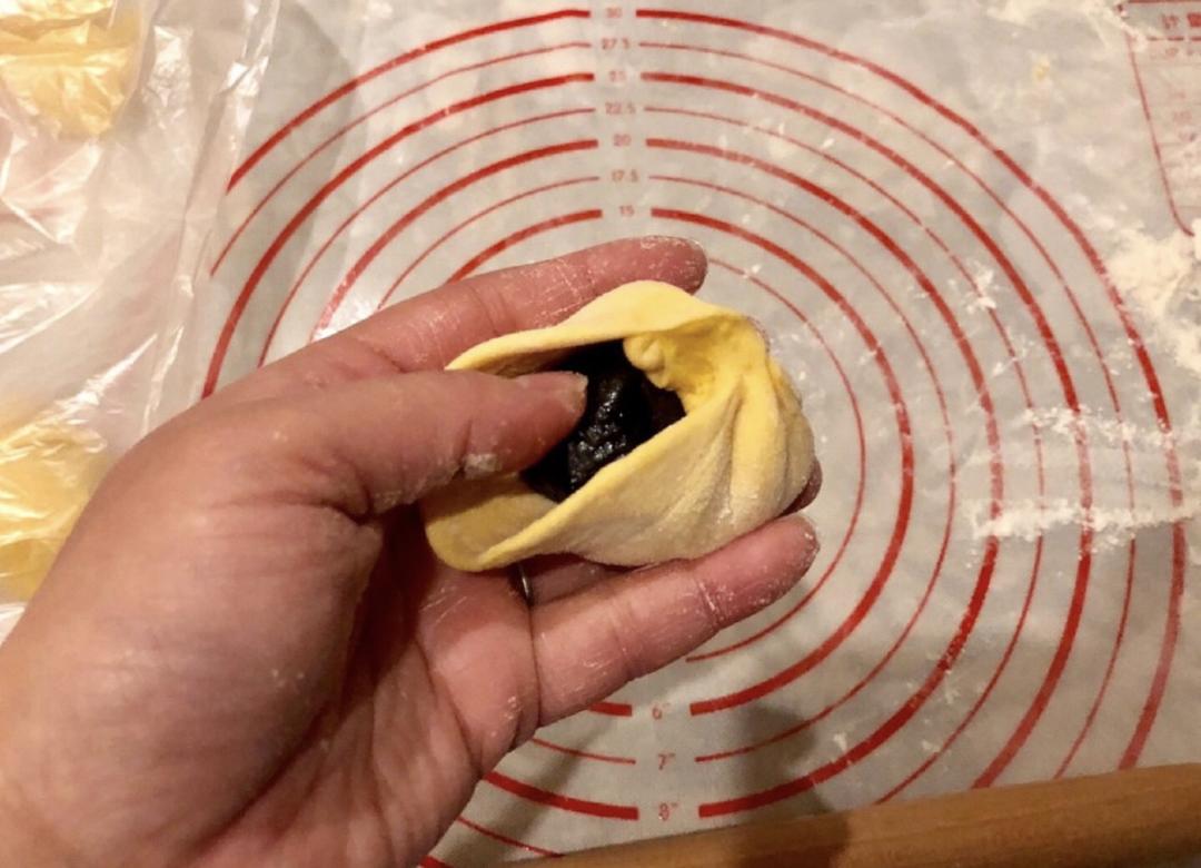 取一个小剂子,按扁,用擀面杖擀成边缘薄中间厚的面片,放入一个豆沙馅