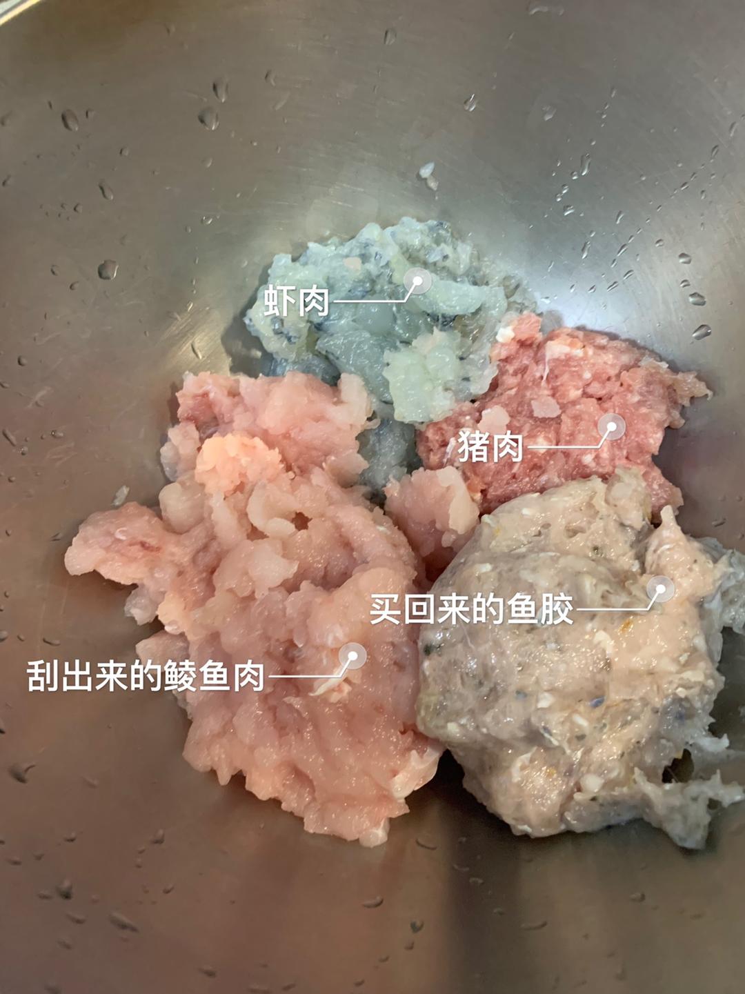 四种肉胶准备好,我是怕鱼肉不够所以市场买了现成鱼肉胶😁