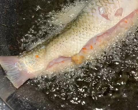 烧热油开始煎鱼,鱼皮煎之前要保持干爽,可以拿厨房纸巾擦擦