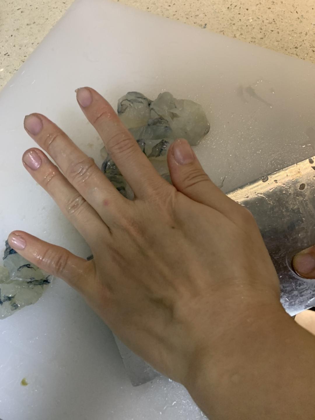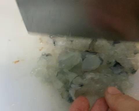 用刀背压扁虾肉
