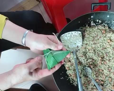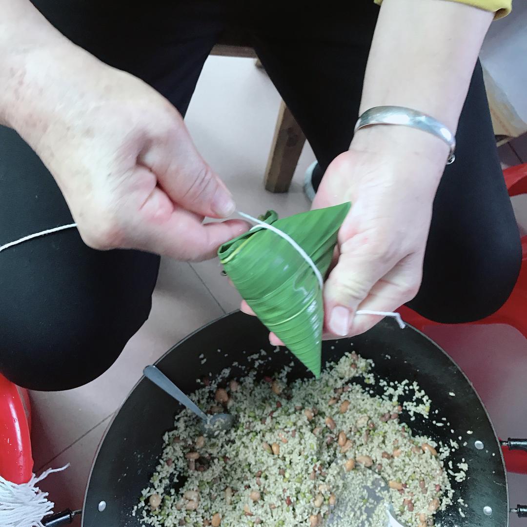 结尾,扎线,我们扎死结,手法好可以扎抽的,老人家风湿关节痛,死结最快最好,这种扎法不需要用太大力绑哦,一样可以包出结实有角的粽子。