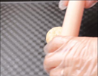 然后再来称量馅料和蛋黄,因为每一个蛋黄重量是不固定的,为了做到蛋黄酥整体重量一致,所以馅料和蛋黄要一起称量
