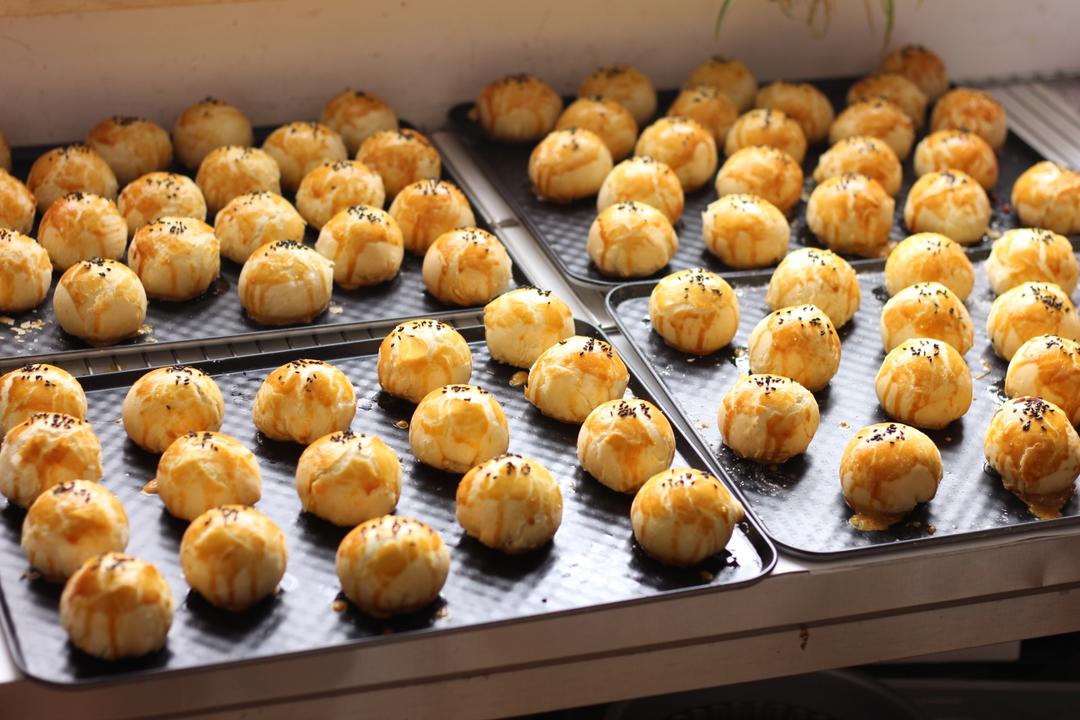 蛋清别着急仍哈,这里分享一个小窍门,蛋黄酥底部裹一下蛋清再烤,会让底部粘的更牢固,不容易底部爆开哈。