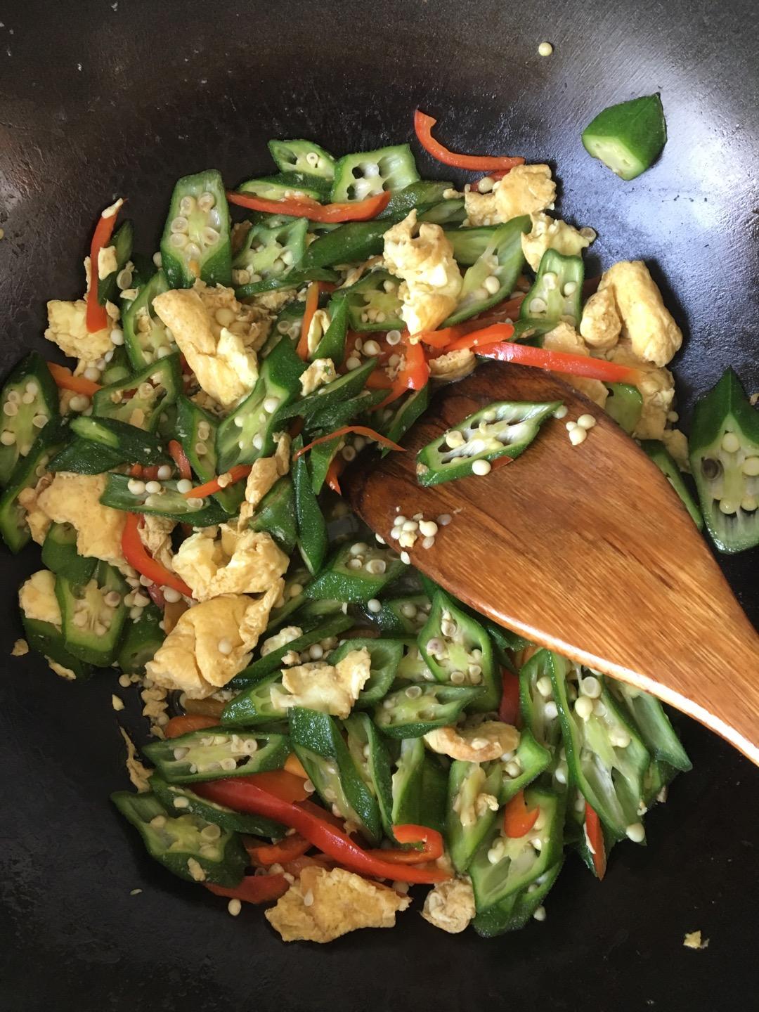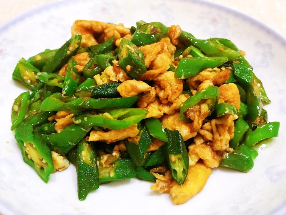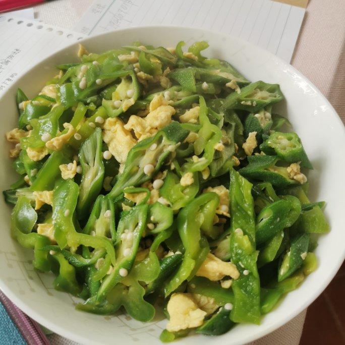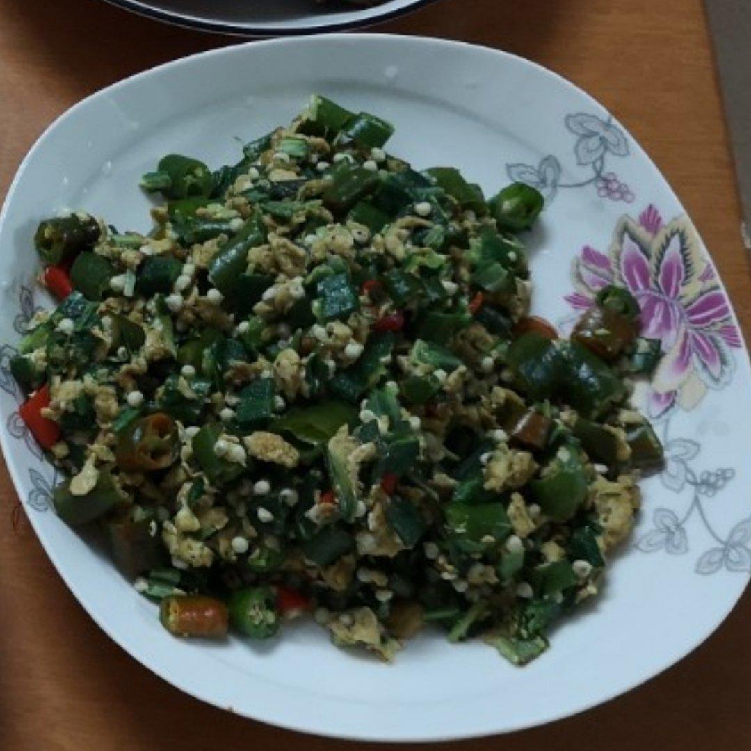 秋葵整个开水中小火过一分钟,鸡蛋炒嫩,炒:姜蒜,辣椒,秋葵,鸡蛋,葱